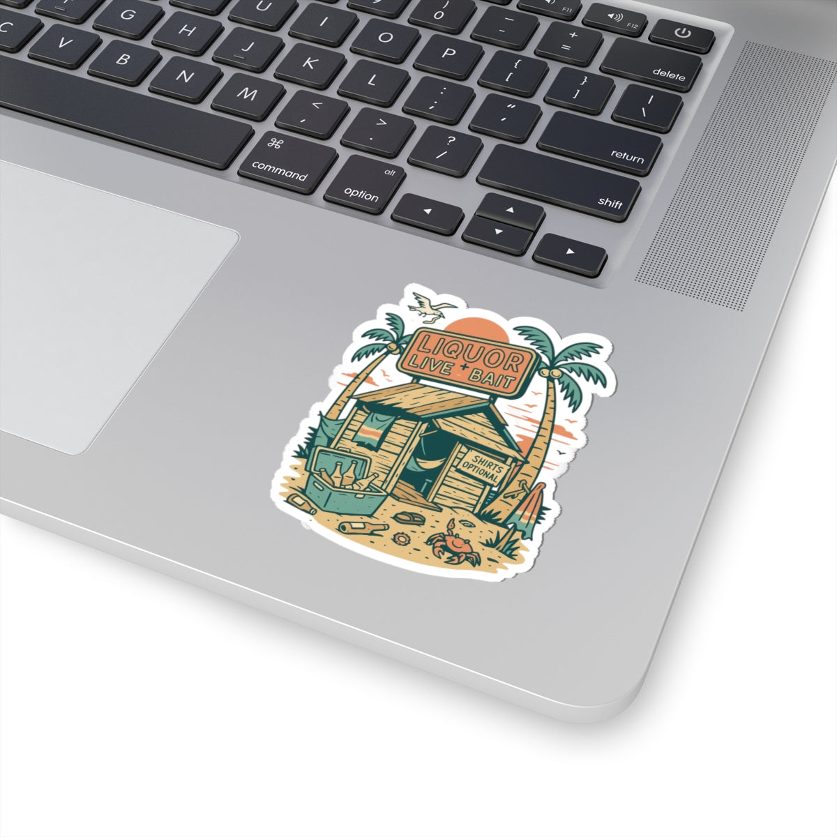Bring the good times wherever you go with this playful beach sticker featuring a tropical bait shack offering “Liquor, Live Bait & Shirts Optional.” Complete with palm trees, a cheeky crab, and a cooler full of cold ones, it’s a fun and lighthearted tribute to laid-back coastal living.