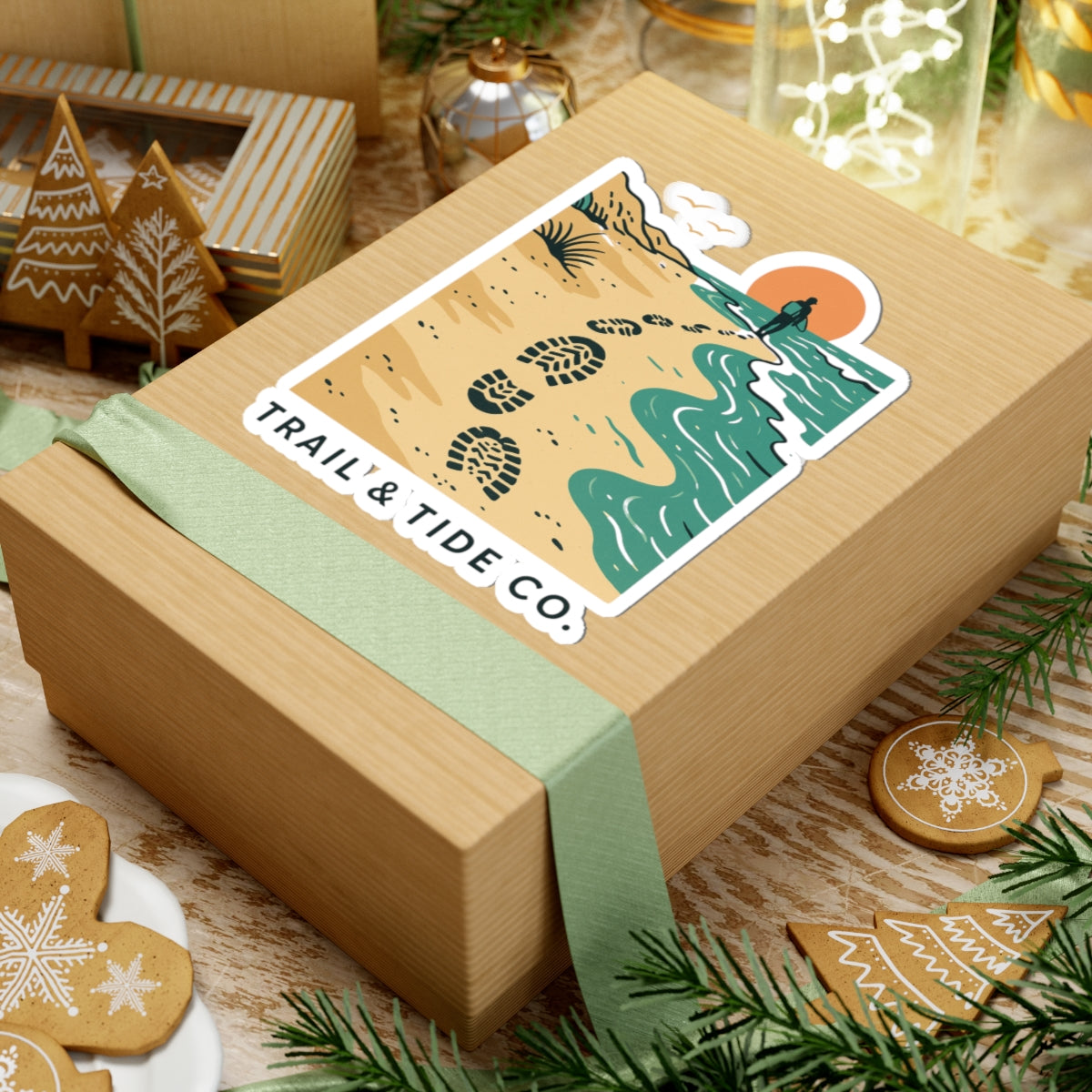 Bring the shore with you wherever you roam. This sticker features rugged bootprints trailing across a sandy beach, kissed by waves and framed by a glowing sunset. A perfect reminder to explore both trail and tide.