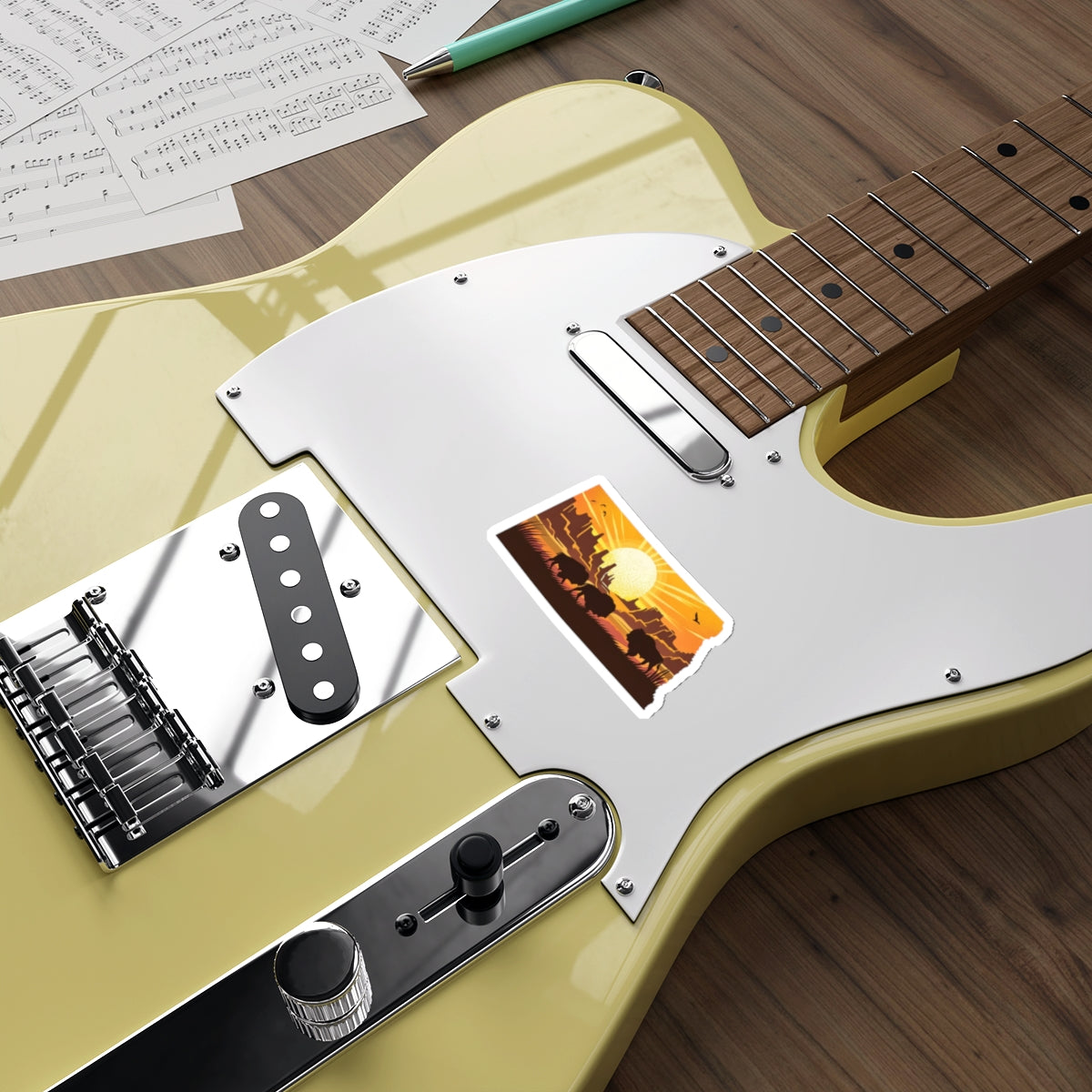 Bring the wild beauty of the Great Plains to your everyday carry with the Dakota Sunset Premium Die-Cut Sticker. Featuring a herd of bison silhouetted against golden cliffs and a blazing prairie sunset, this design captures the iconic spirit of the Dakotas. Die-cut to the shape of North Dakota, it’s a perfect nod to wide-open skies and untamed horizons.