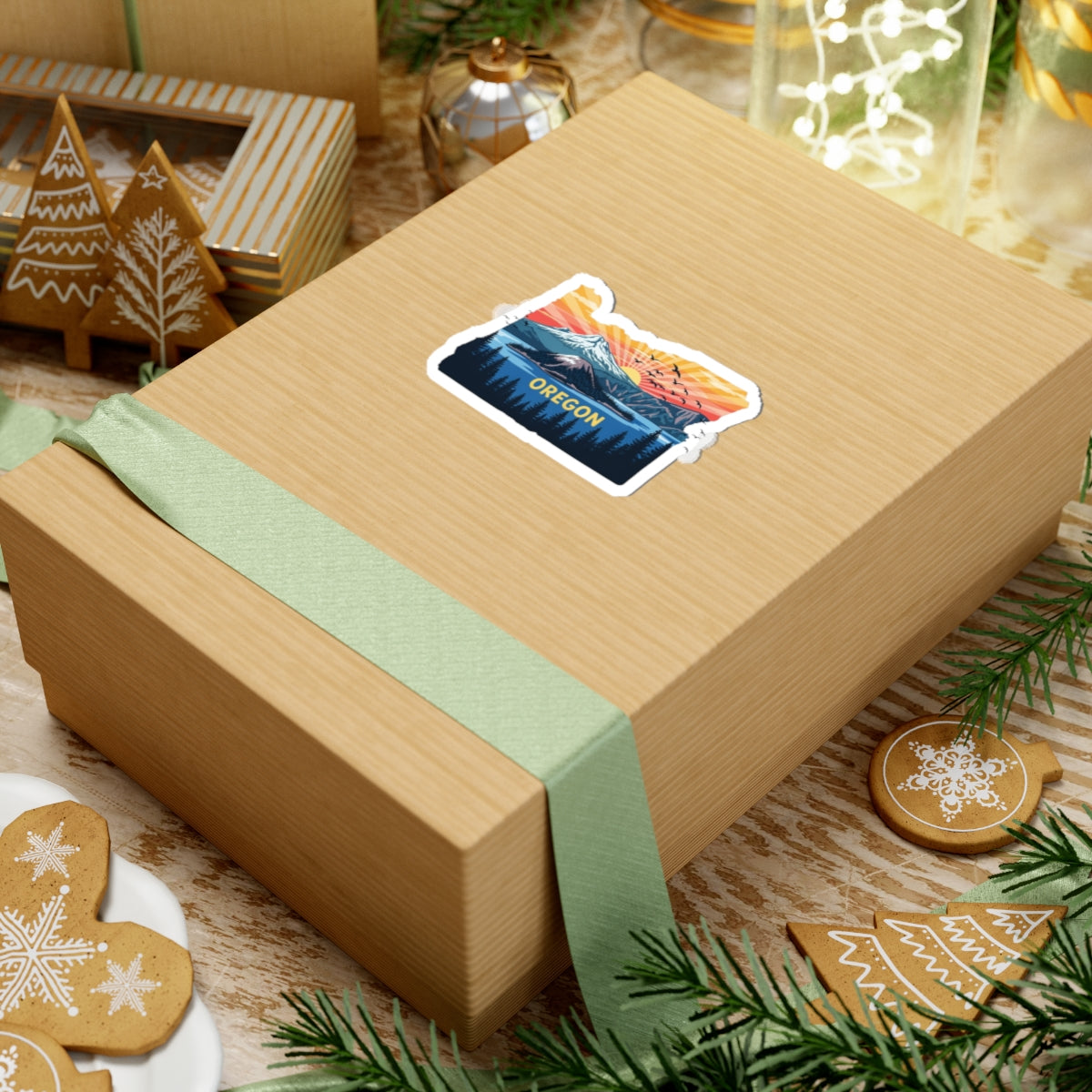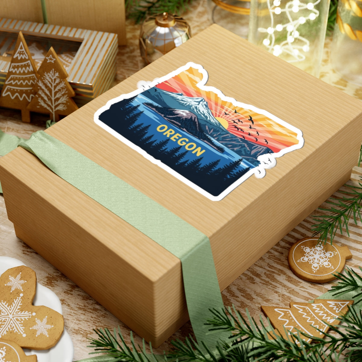 Peaks of Oregon Sticker | Oregon State Outline with Mt. Hood, Sunrise Sky, and Pine Forest – Vibrant PNW Wilderness Vinyl Sticker