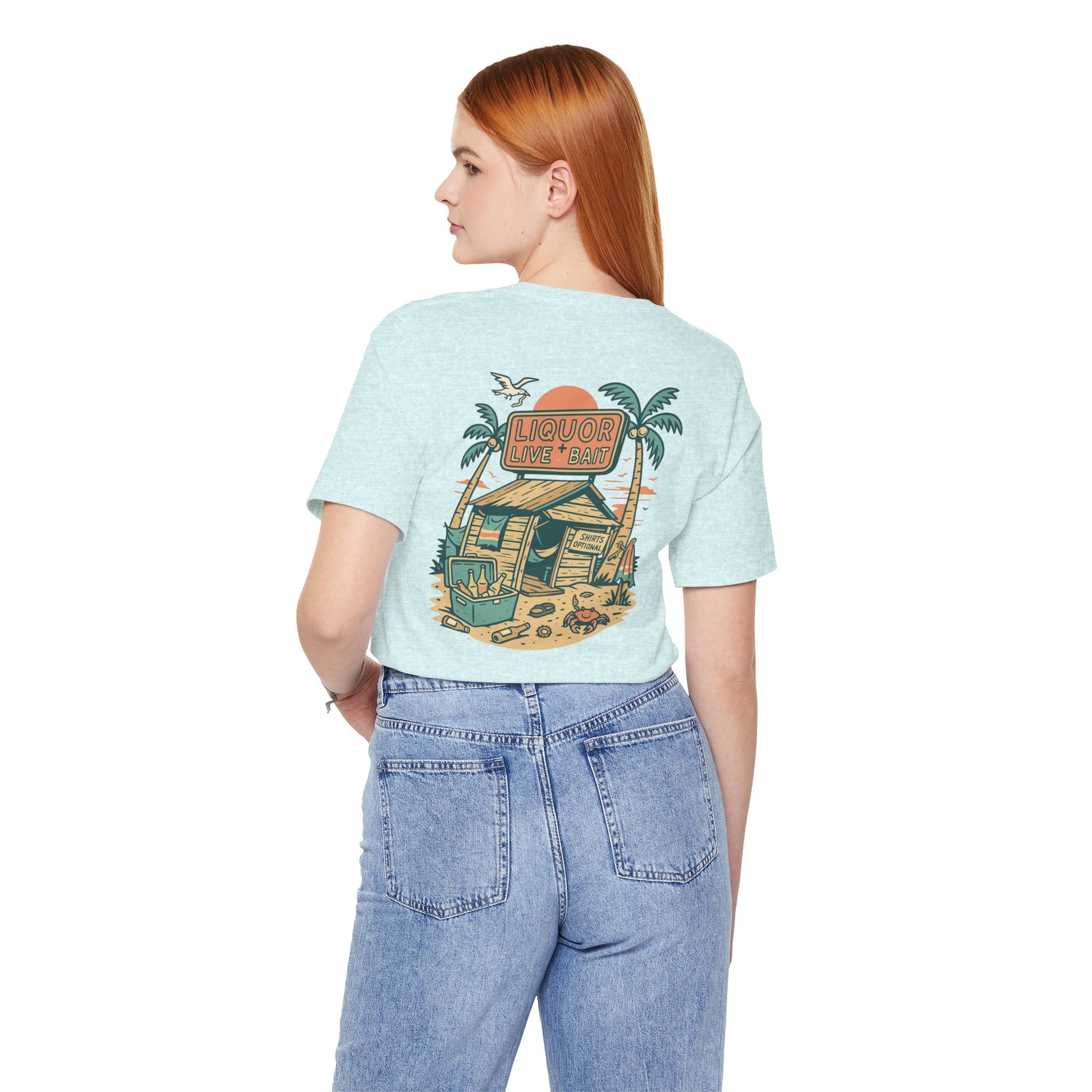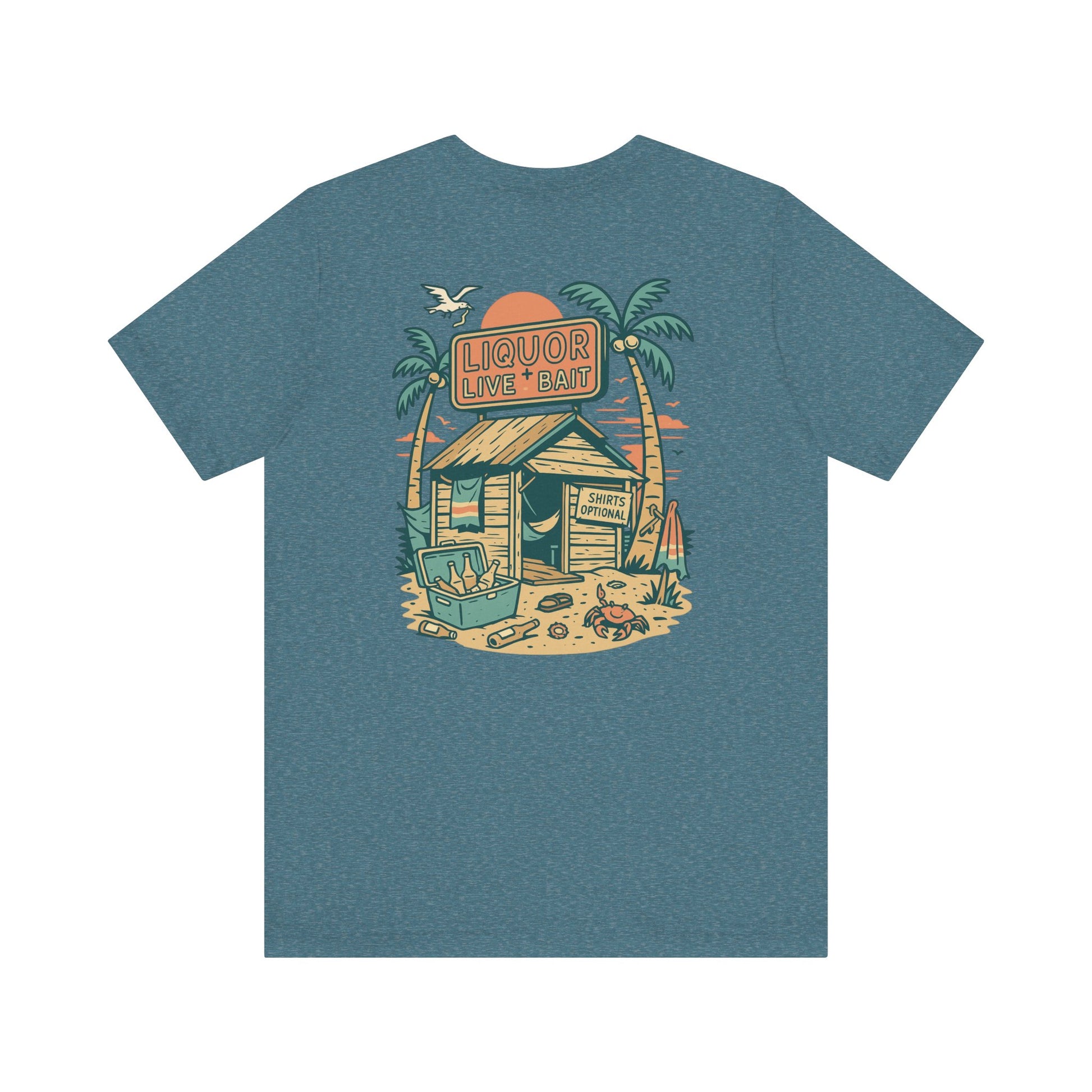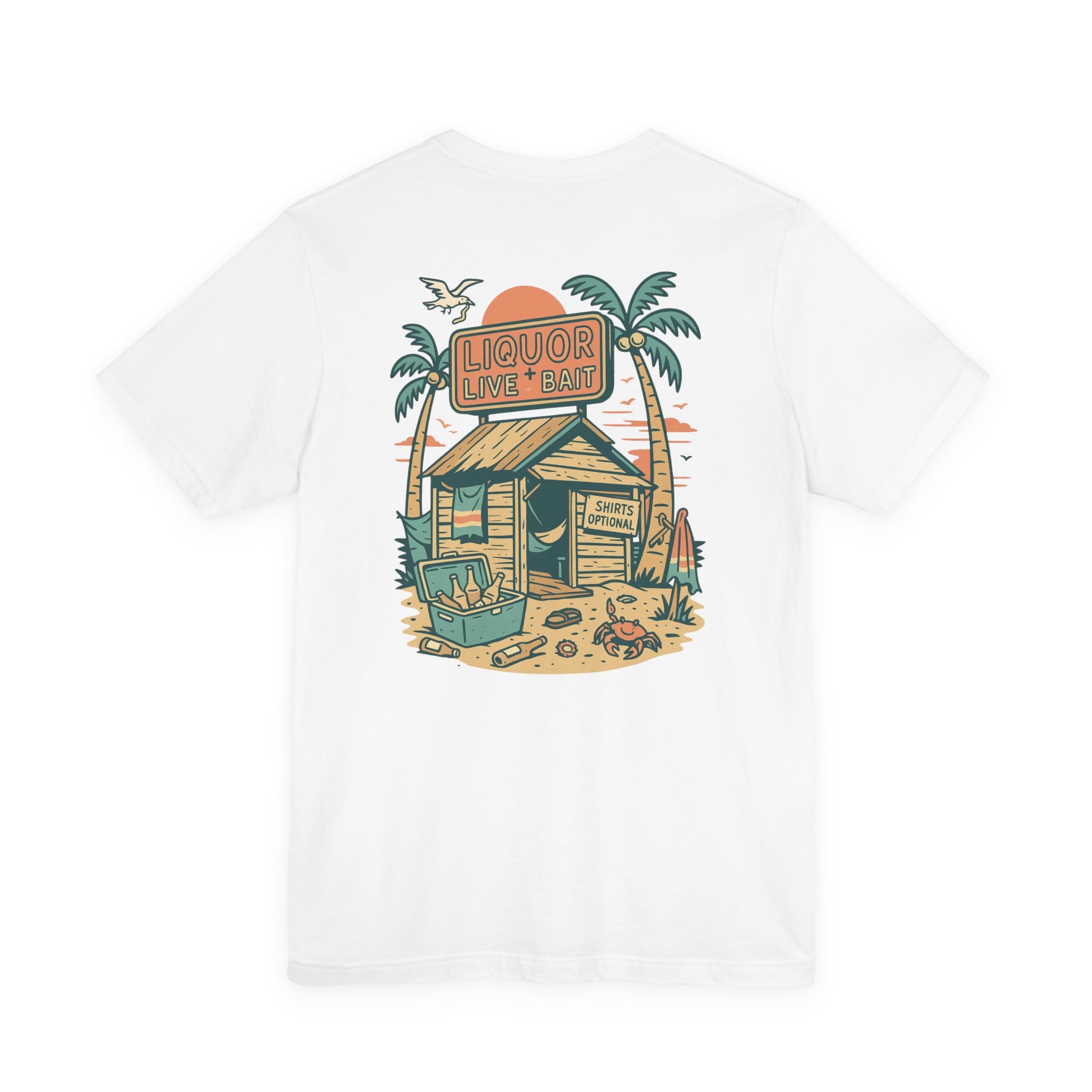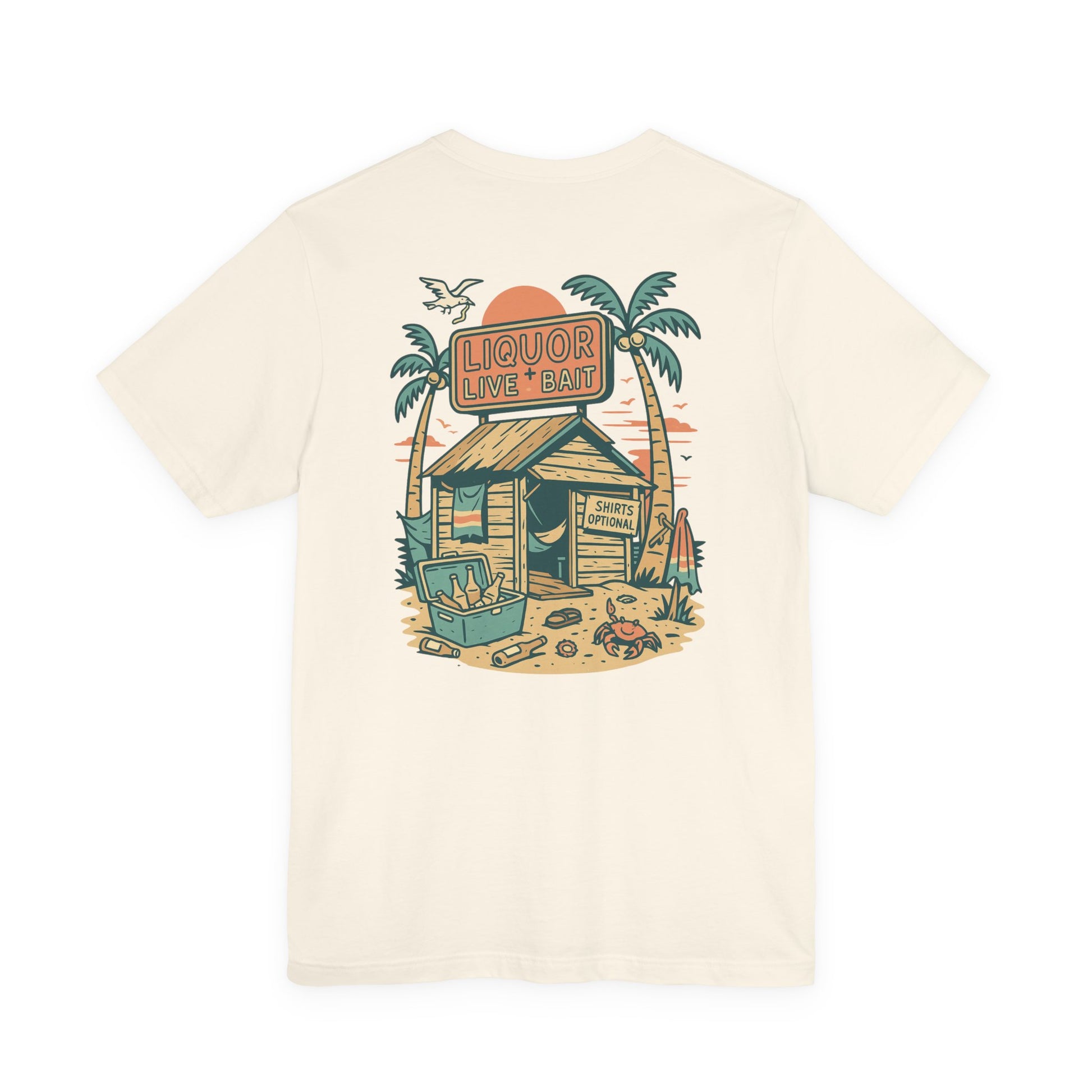 Whether you're stumbling into a beach bar or just dreaming of sandy sunsets, the Sunburnt & Buzzed Tee brings the party with you. This playful design features a laid-back tropical shack slinging “Liquor, Live Bait & Vibes,” complete with a crab, cooler, and an open-door policy—shirts optional. Perfect for sun-chasers, beer-lovers, and coastal drifters, it's a warm-weather statement that doesn't take itself too seriously.