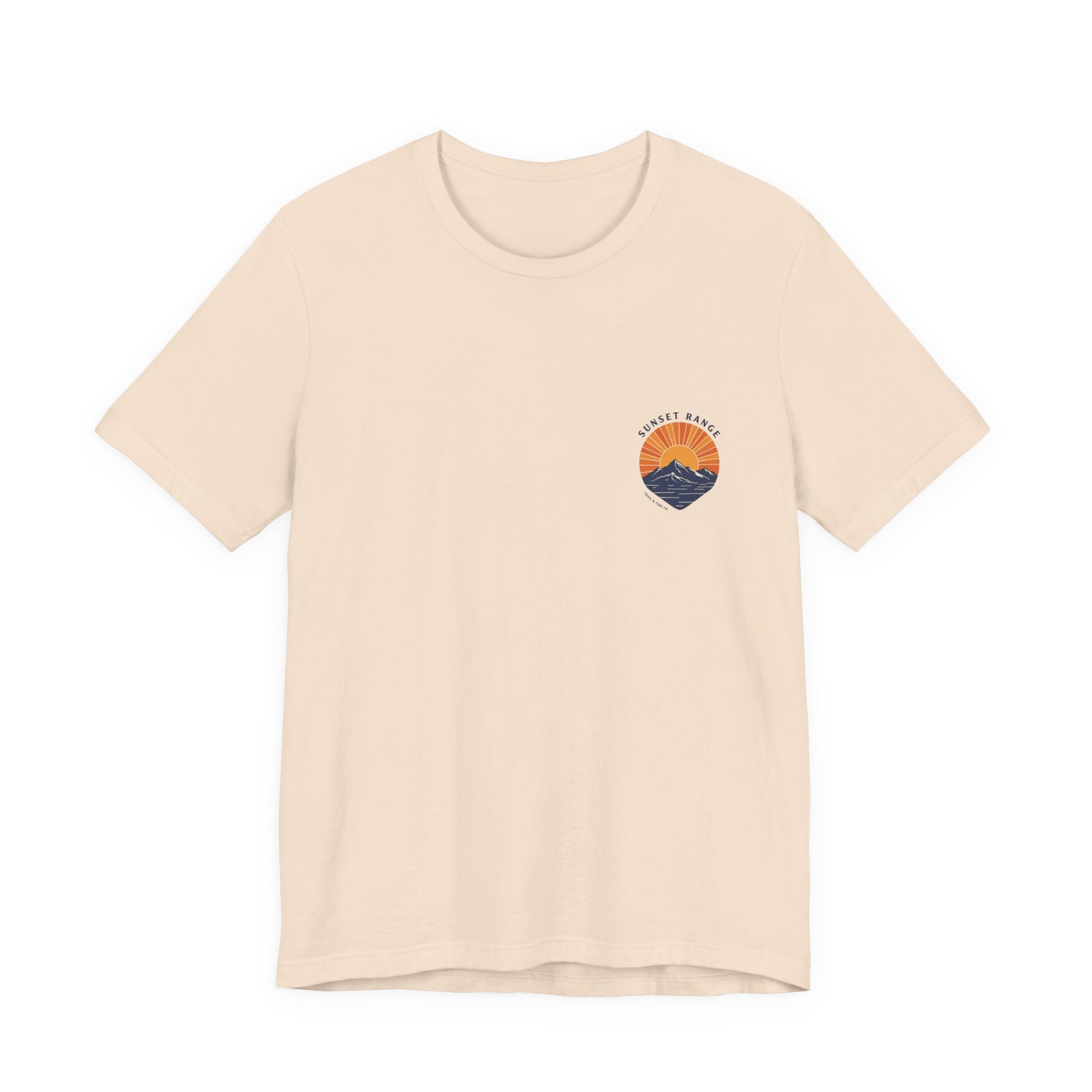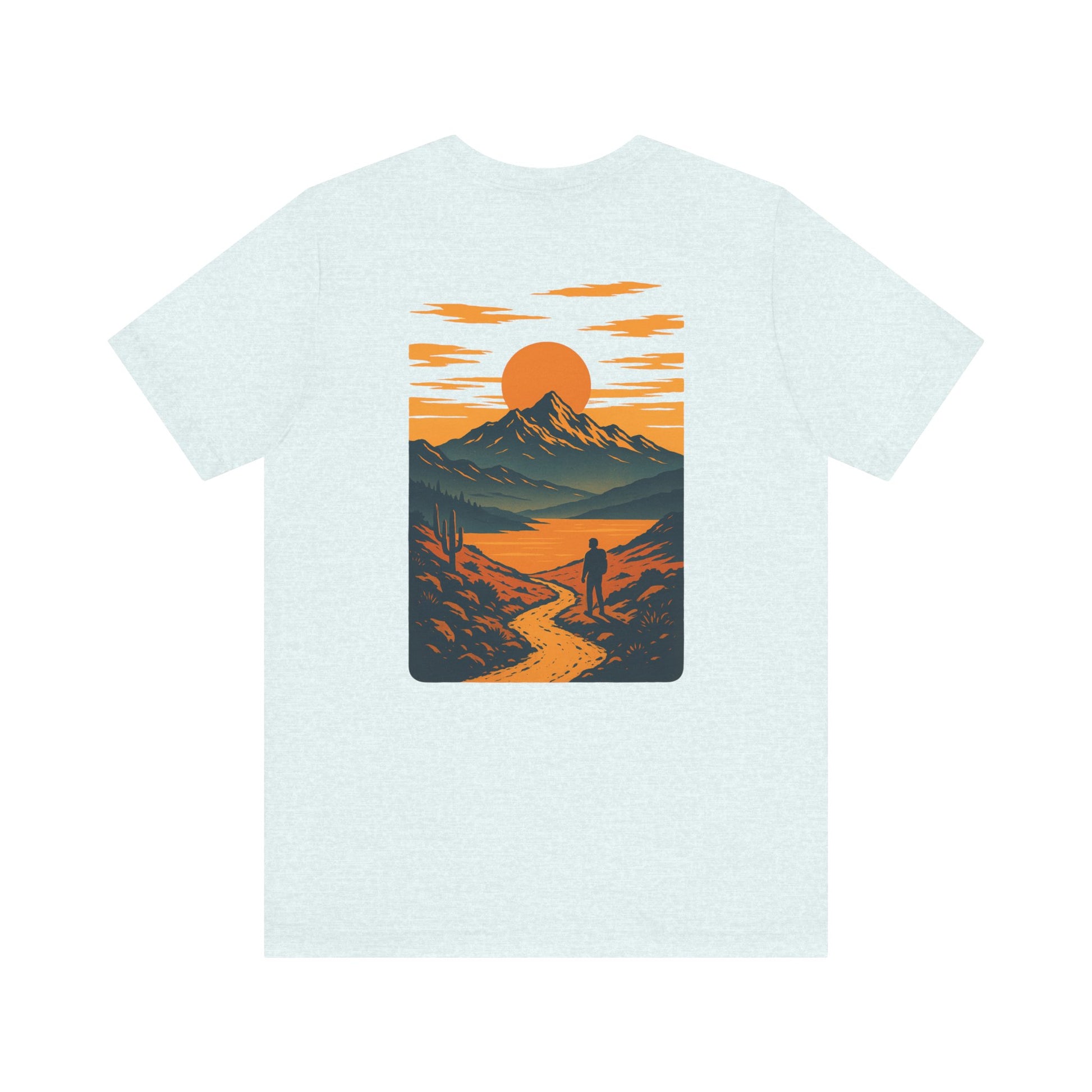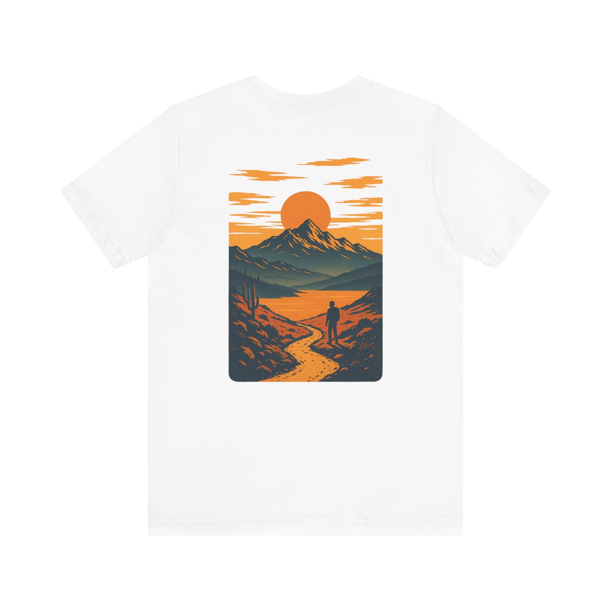 Step into golden hour with the Sunset Range Tee. Featuring a bold desert landscape in rich orange hues, this design captures the spirit of a lone hiker wandering toward a radiant mountain horizon. The striking back graphic is paired with a coordinating front crest patch that reads Sunset Range — a nod to those who find peace in the path ahead. Whether you're gearing up for the next adventure or chasing the last light, this tee radiates warmth, wanderlust, and wild serenity.