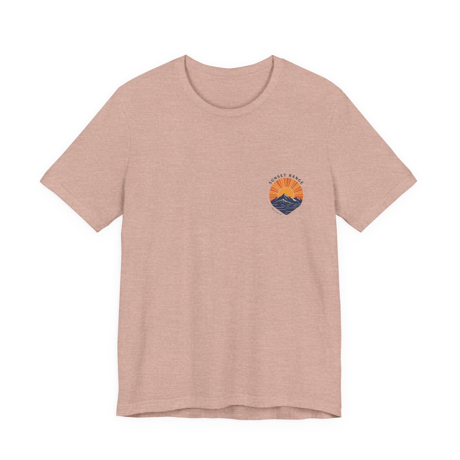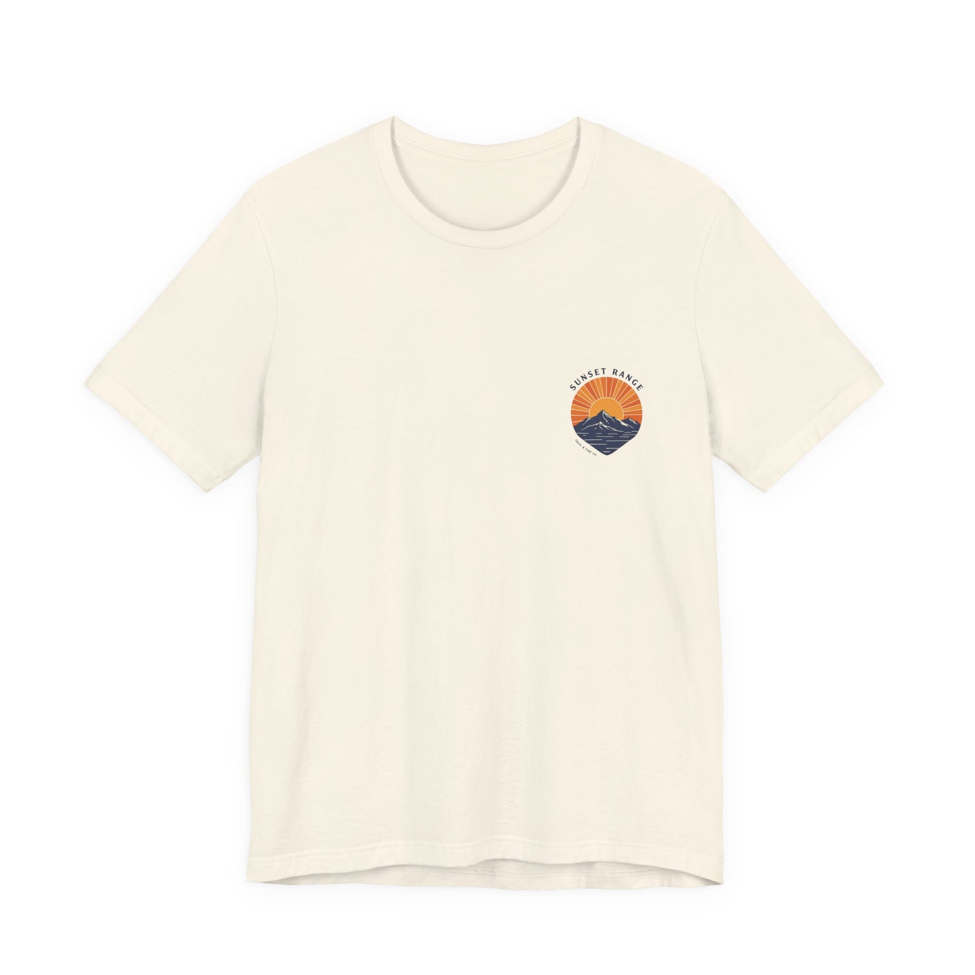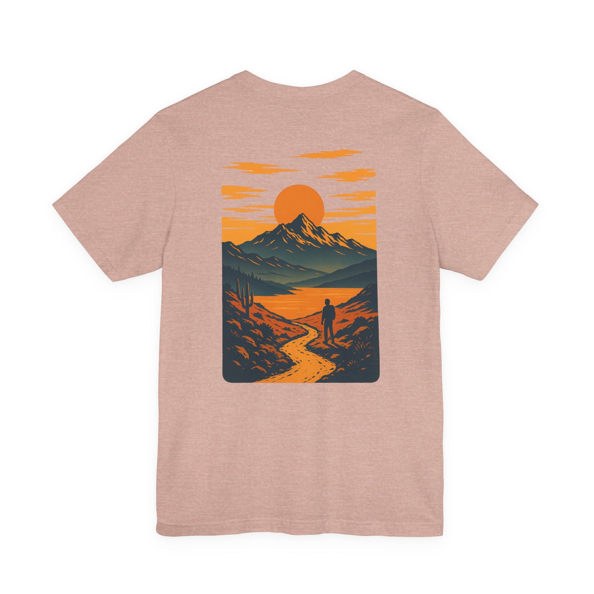 Step into golden hour with the Sunset Range Tee. Featuring a bold desert landscape in rich orange hues, this design captures the spirit of a lone hiker wandering toward a radiant mountain horizon. The striking back graphic is paired with a coordinating front crest patch that reads Sunset Range — a nod to those who find peace in the path ahead. Whether you're gearing up for the next adventure or chasing the last light, this tee radiates warmth, wanderlust, and wild serenity.