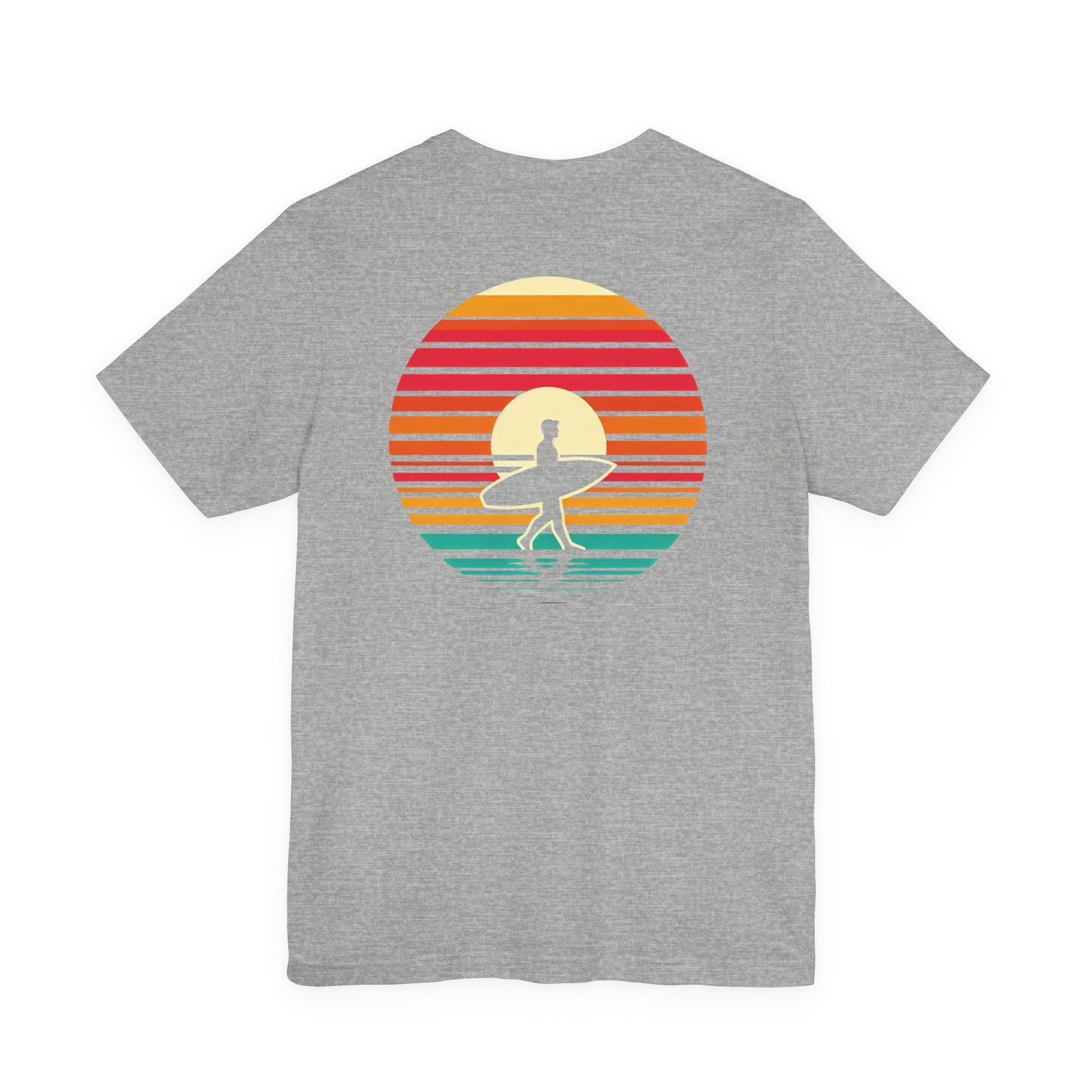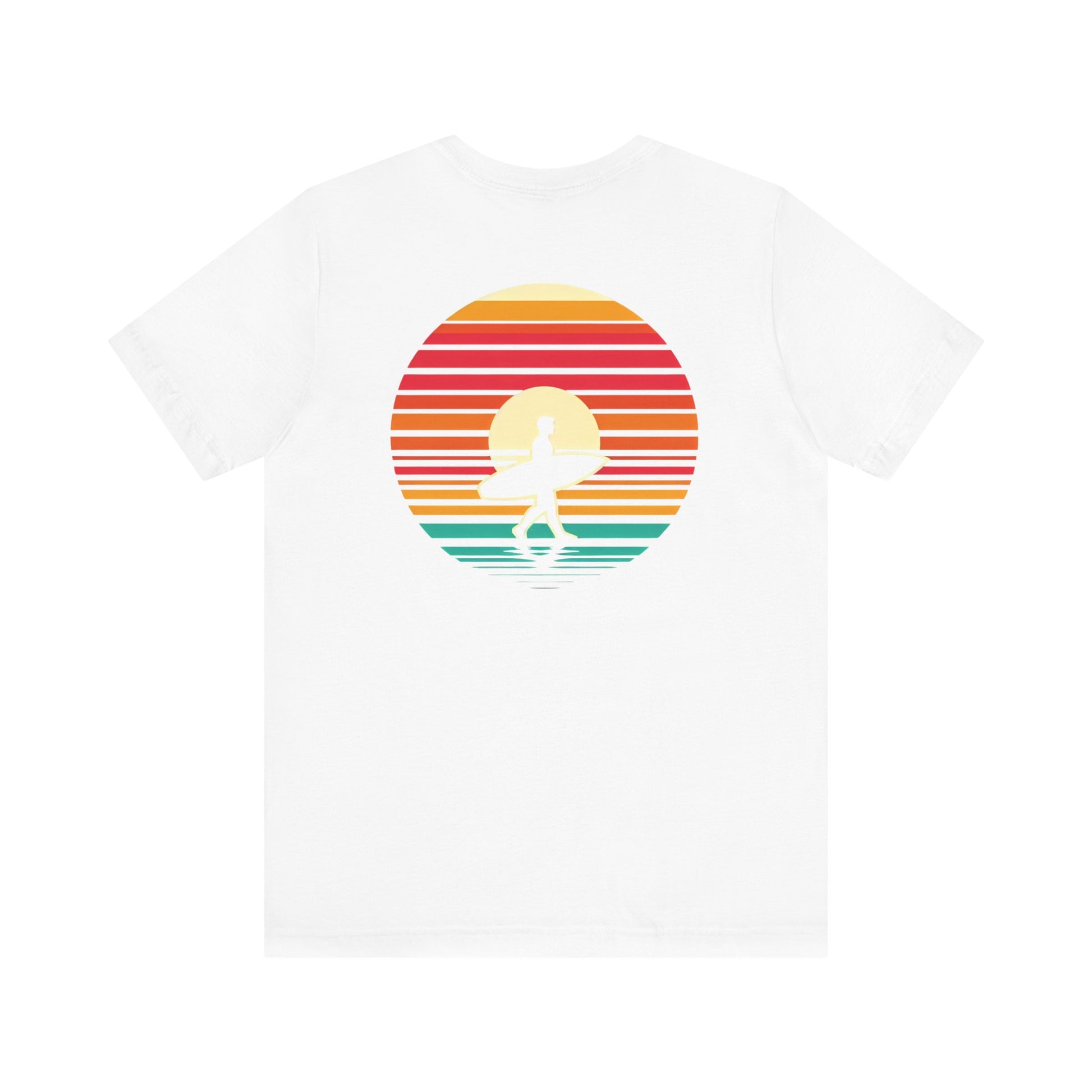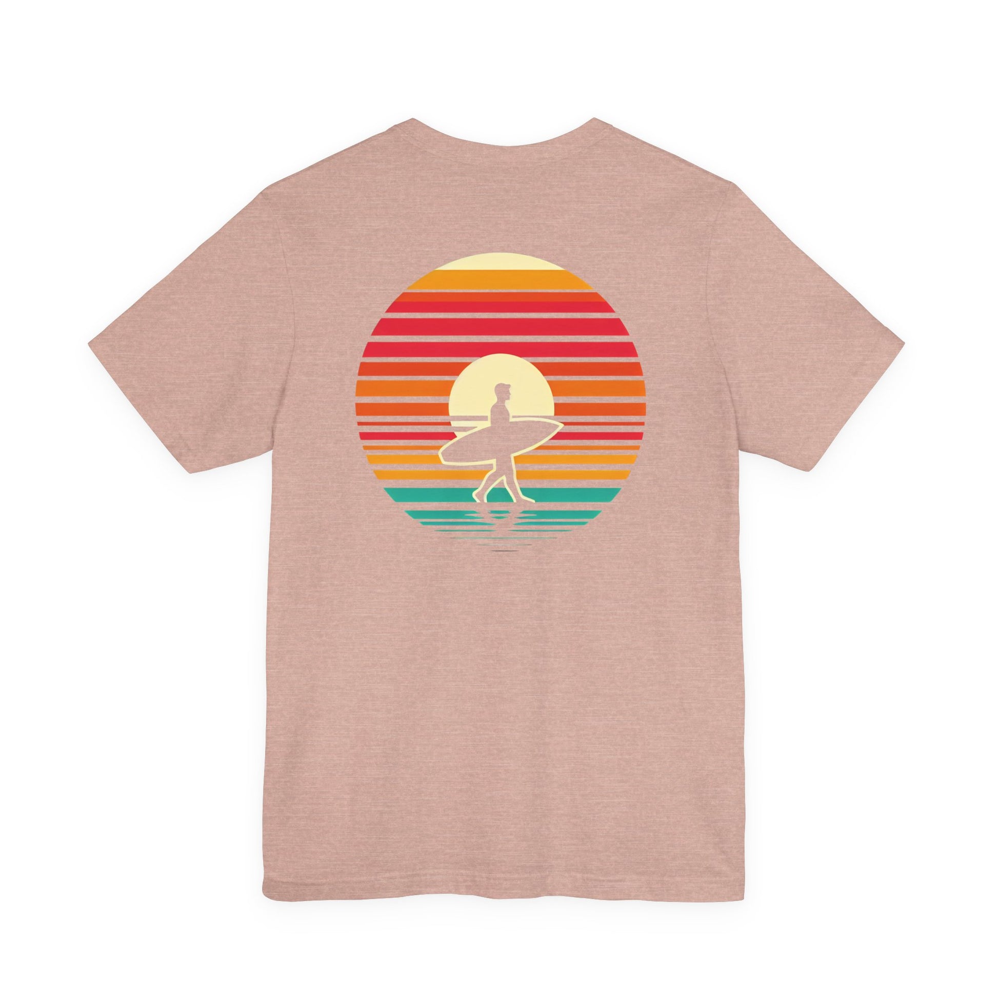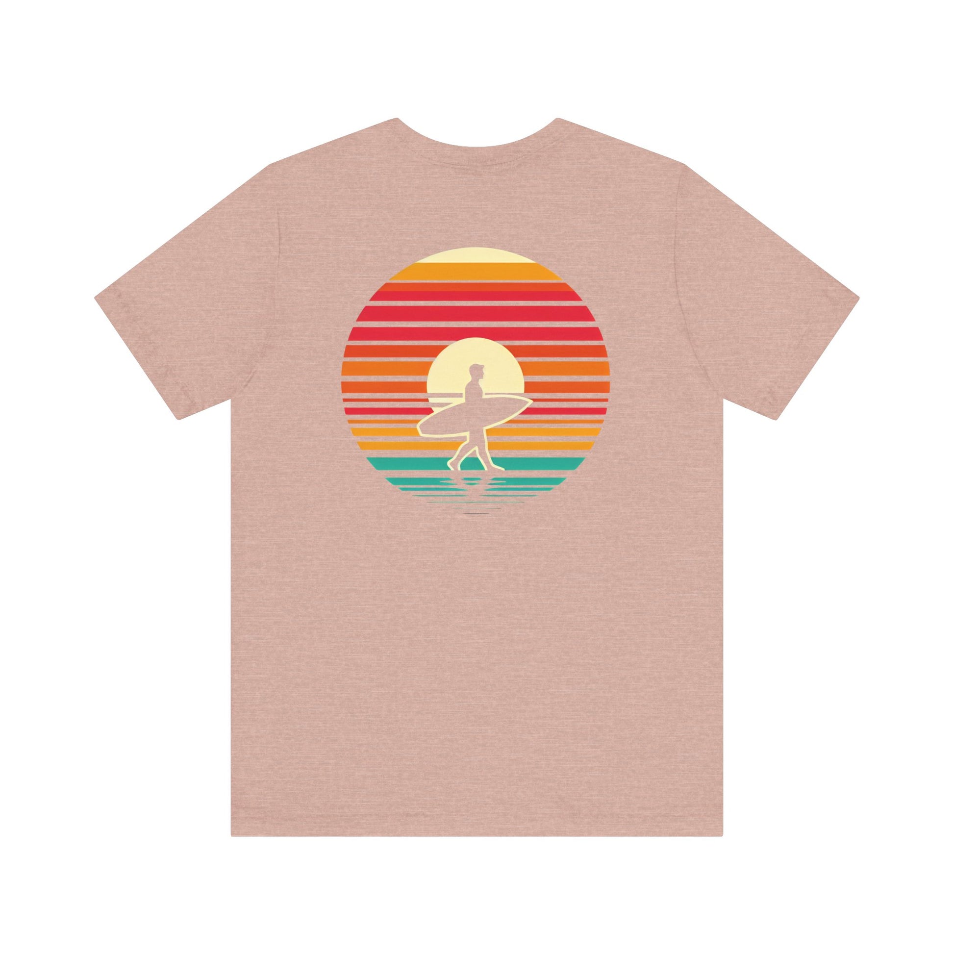 Catch coastal vibes with our Sunset Surfer Tee, designed for those who feel most at home under the sun and near the sea. This design features a silhouetted surfer walking along the beach, framed by bold, sunset-hued stripes that radiate warmth and adventure. The front left chest shows a mini coastal stamp design that reads Sun-Kissed Paradise – Relax. Explore. Unwind., while the back print showcases the full sunset scene in vivid retro colors. Whether you're cruising the boardwalk or chasing waves, this shirt brings the beach to you.