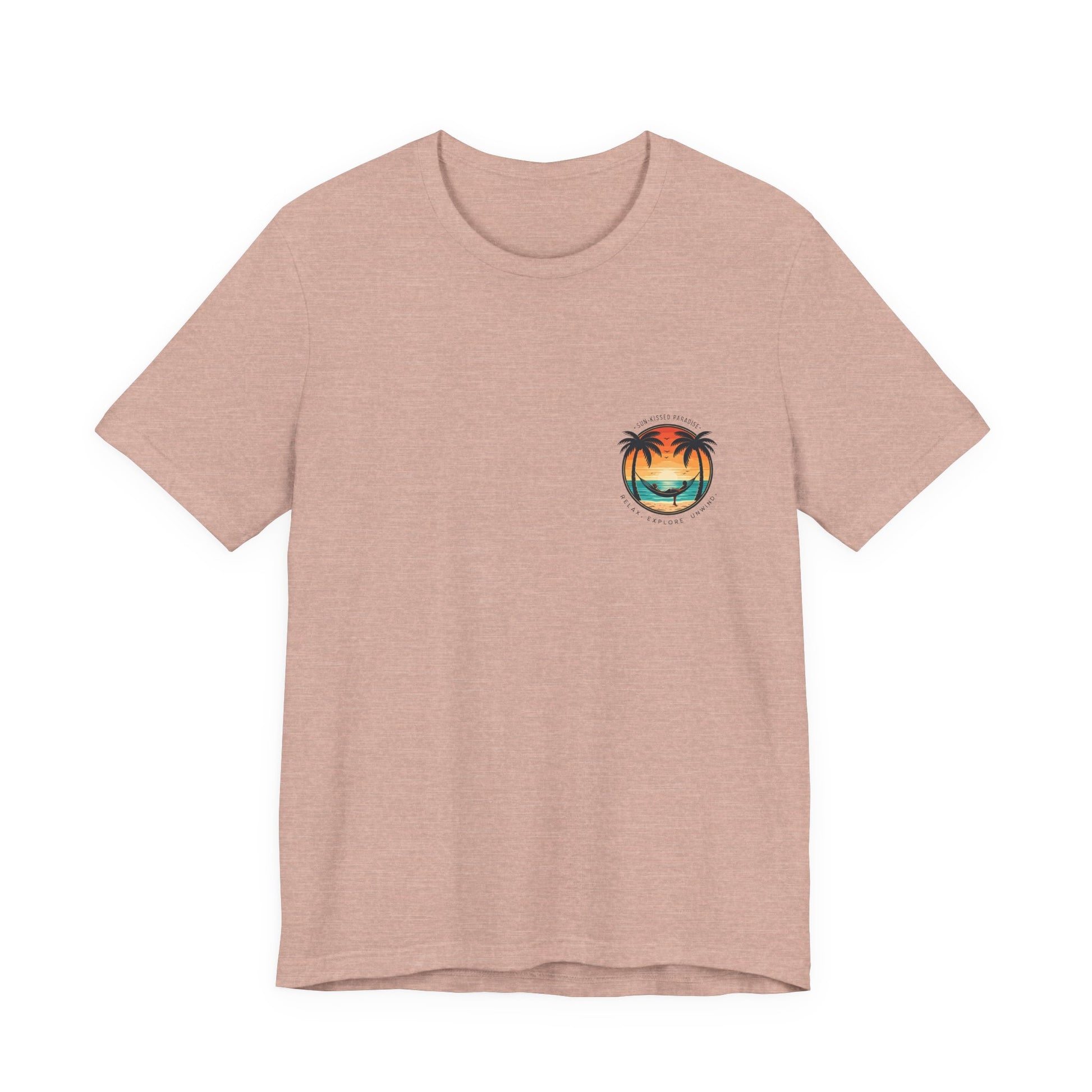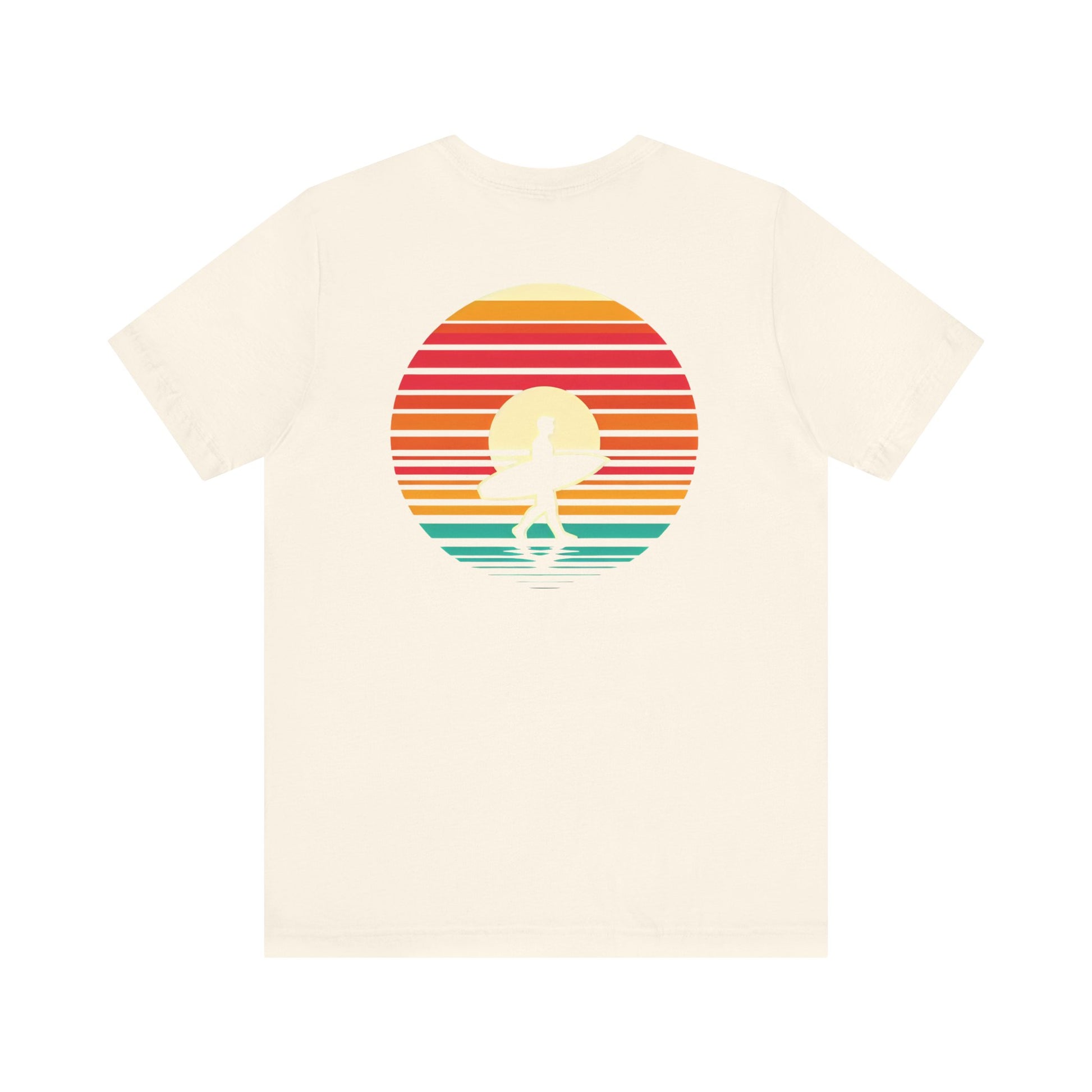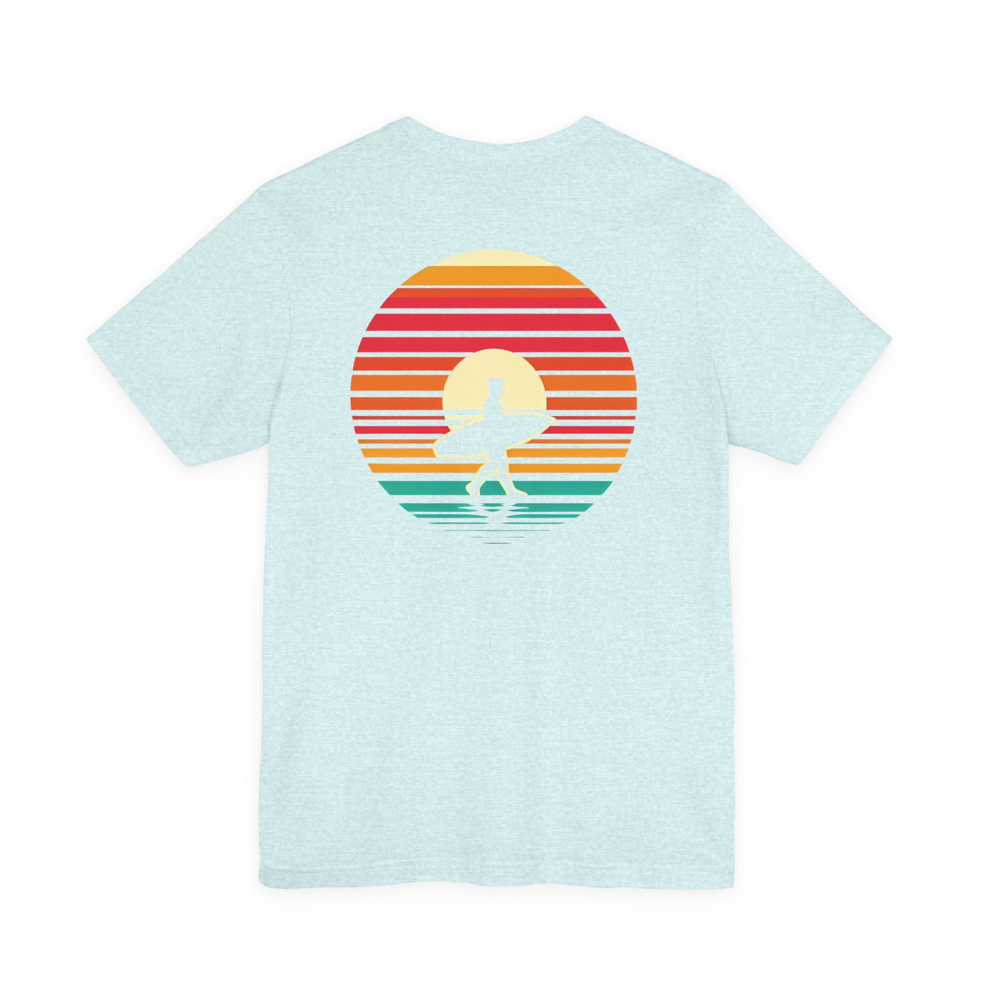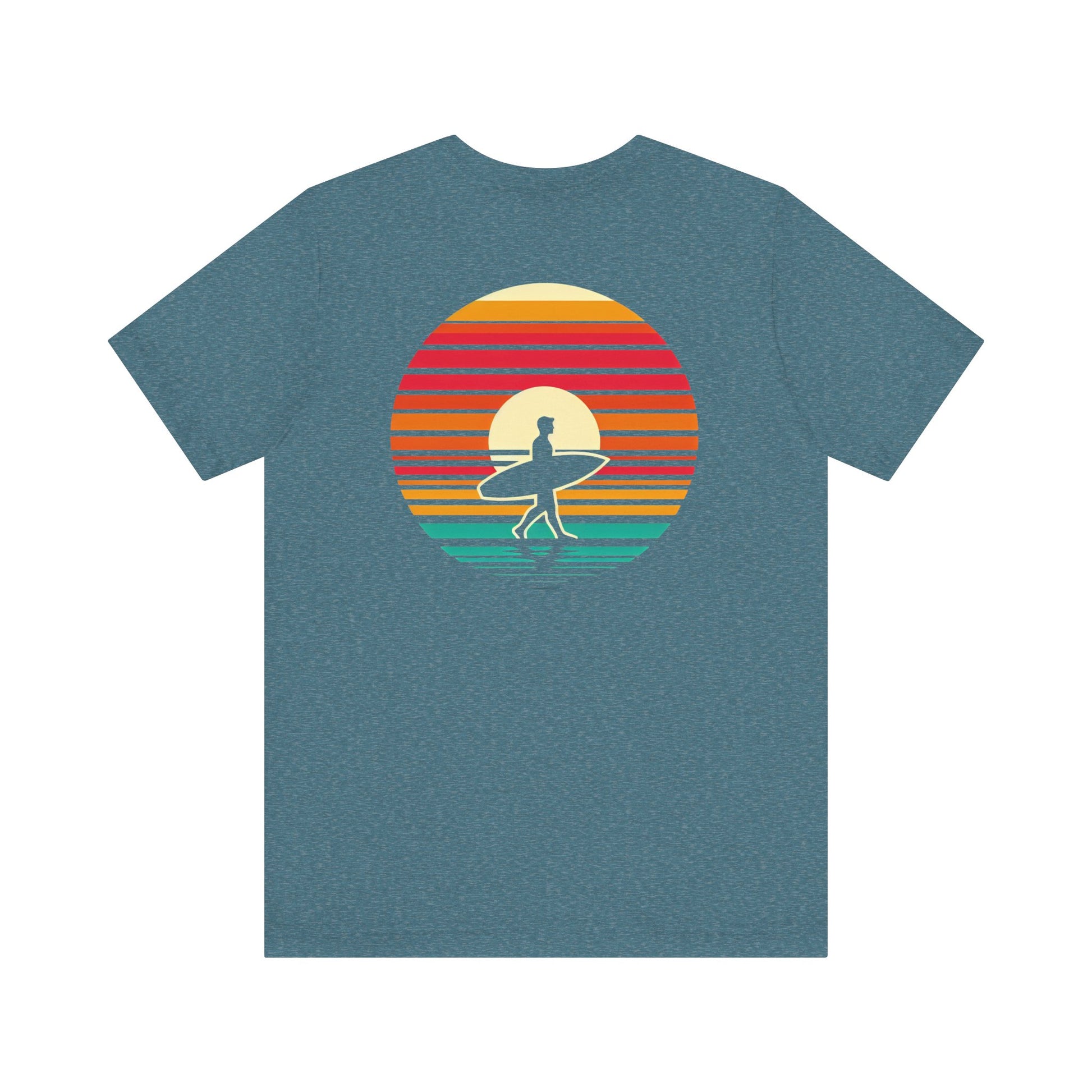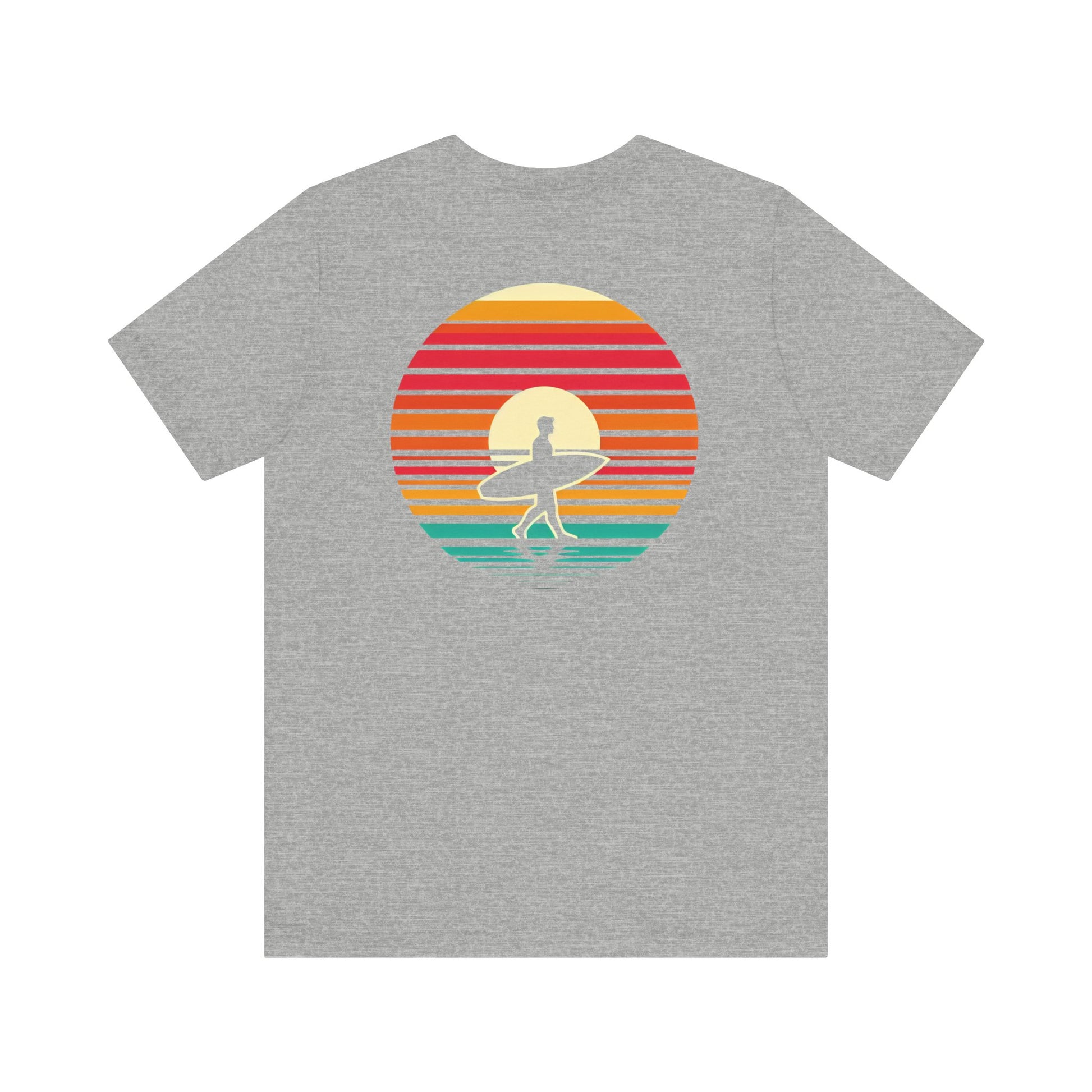 Catch coastal vibes with our Sunset Surfer Tee, designed for those who feel most at home under the sun and near the sea. This design features a silhouetted surfer walking along the beach, framed by bold, sunset-hued stripes that radiate warmth and adventure. The front left chest shows a mini coastal stamp design that reads Sun-Kissed Paradise – Relax. Explore. Unwind., while the back print showcases the full sunset scene in vivid retro colors. Whether you're cruising the boardwalk or chasing waves, this shirt brings the beach to you.