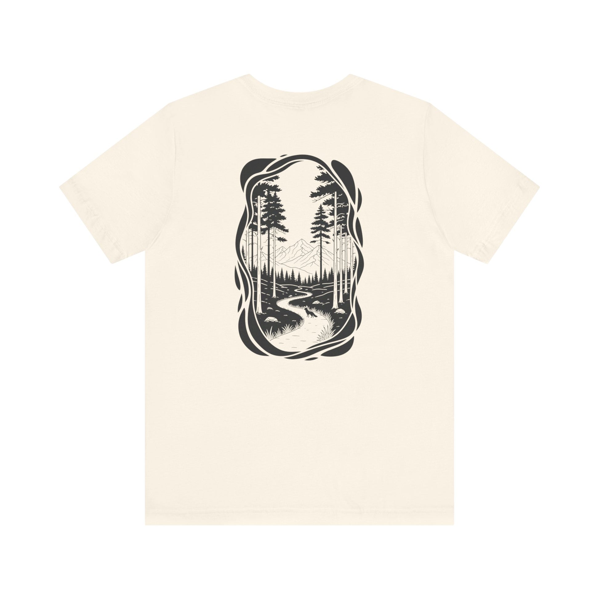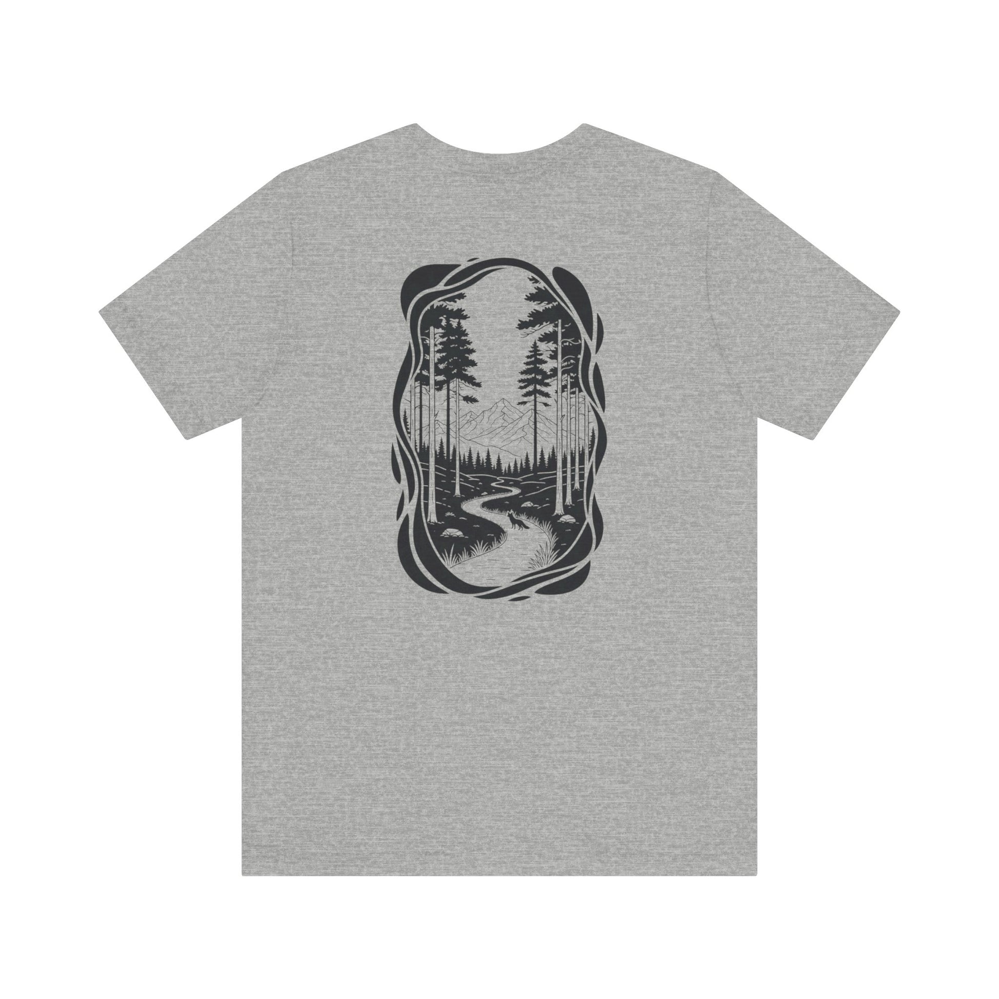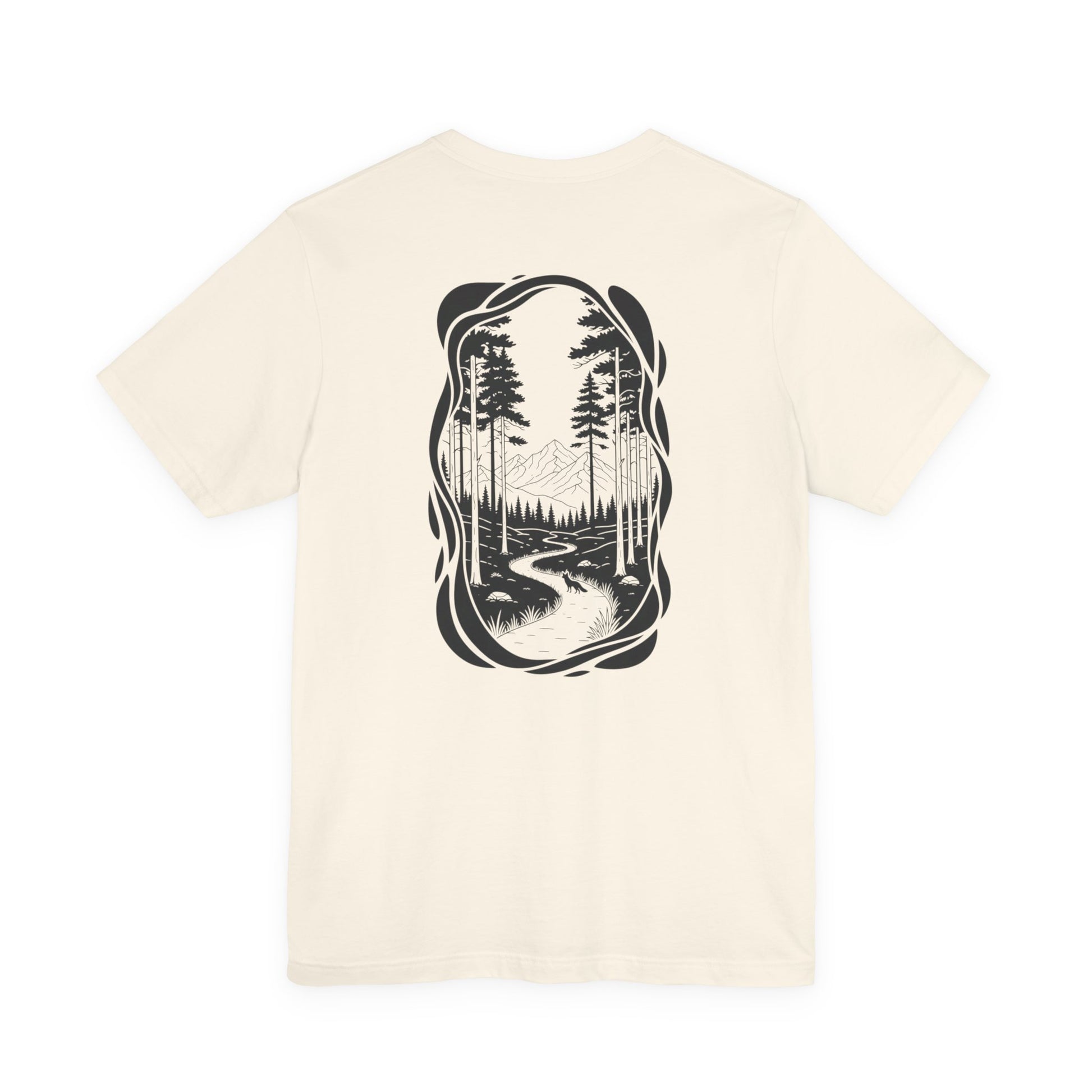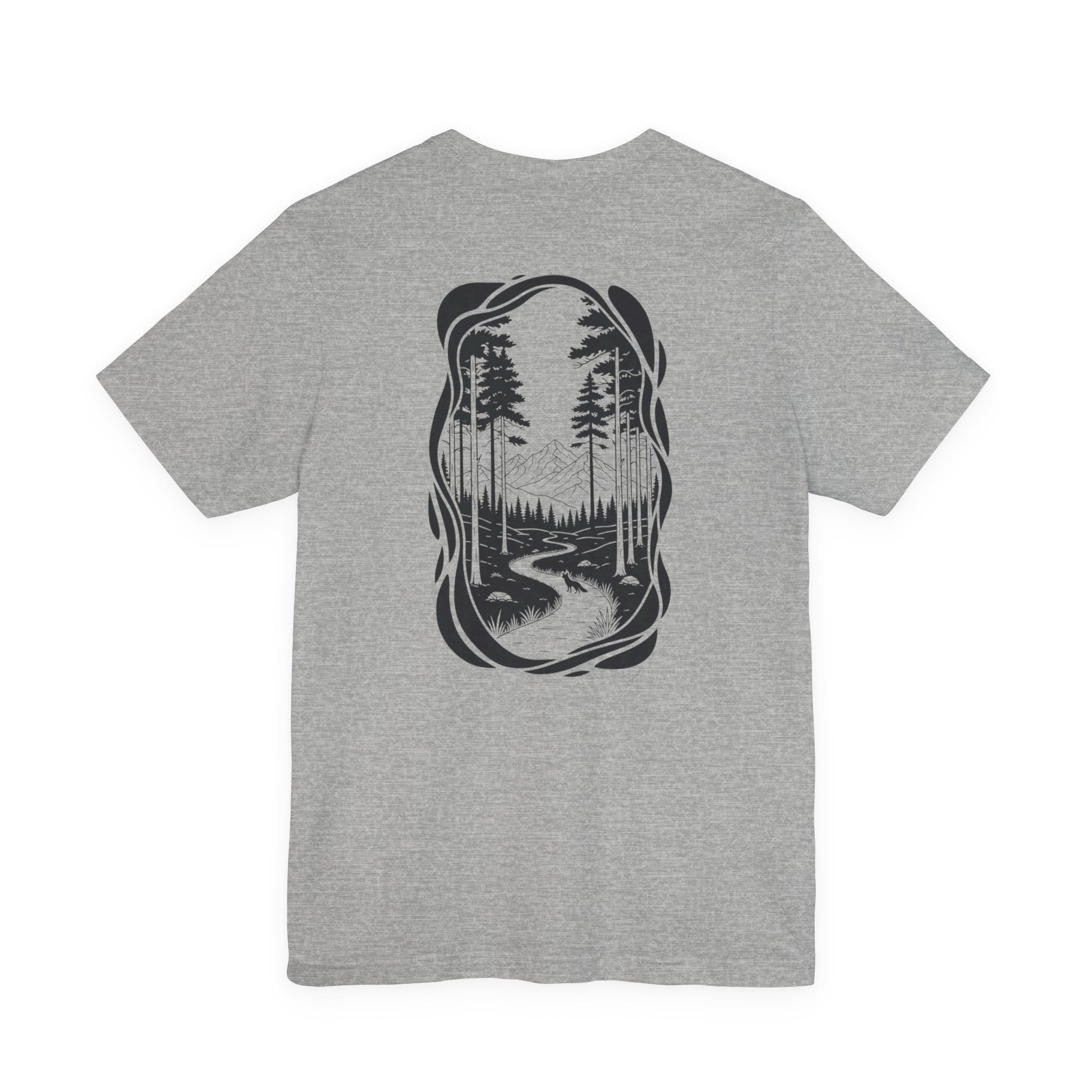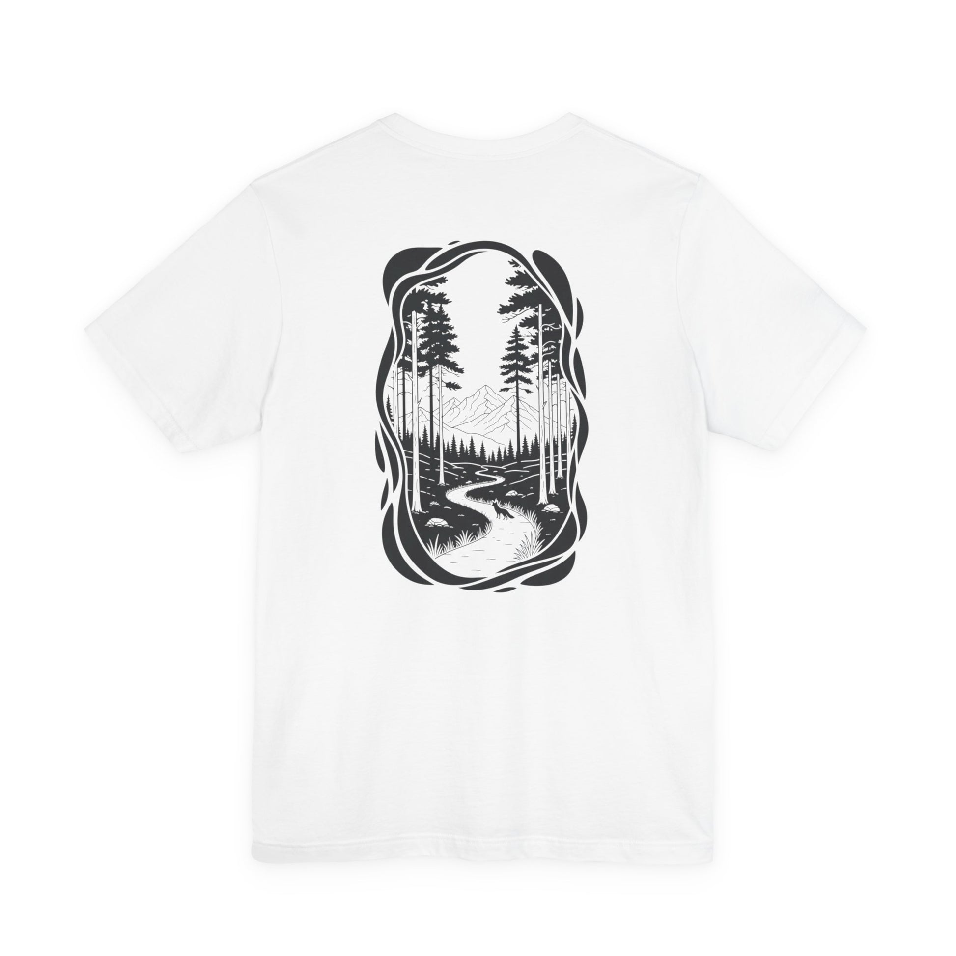 Simple, bold, and quietly captivating — The Trail Ahead Tee features a flowing path through towering pines toward distant mountains, framed in an organic border that feels carved by nature itself. This black and white graphic invites reflection, wanderlust, and a reminder to keep moving forward—one step at a time.