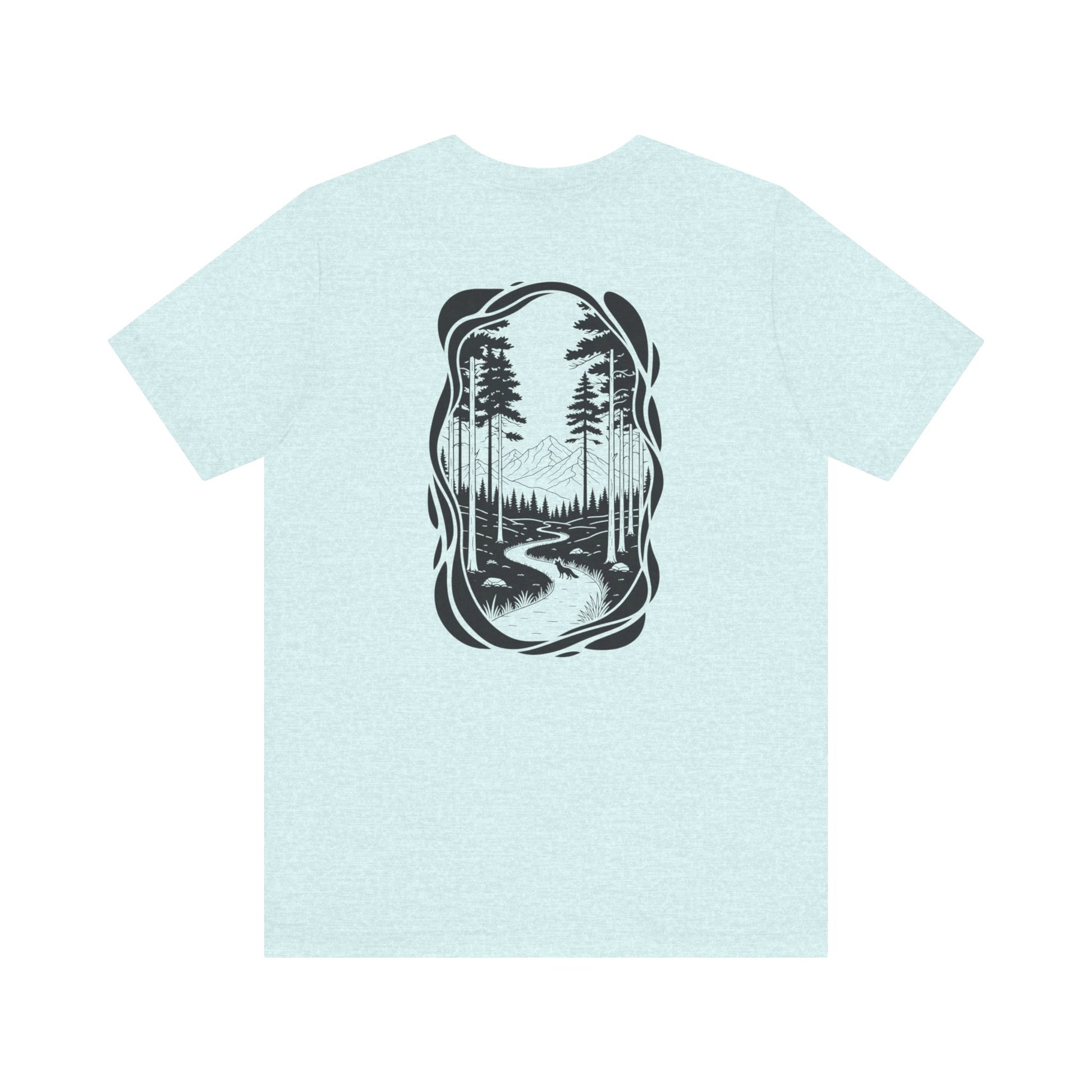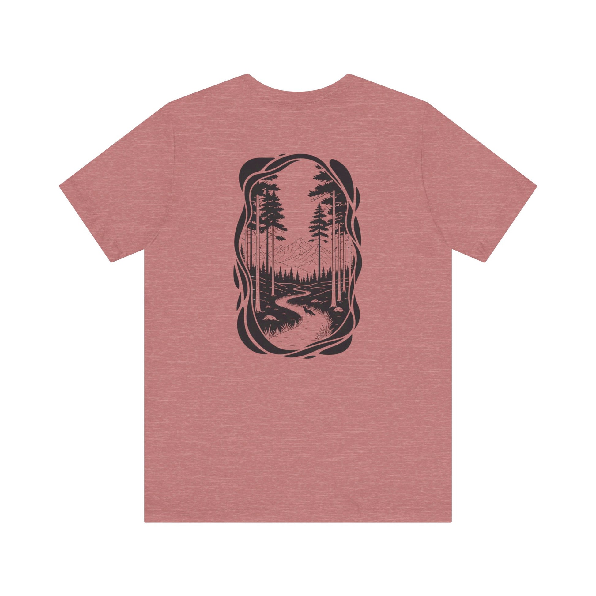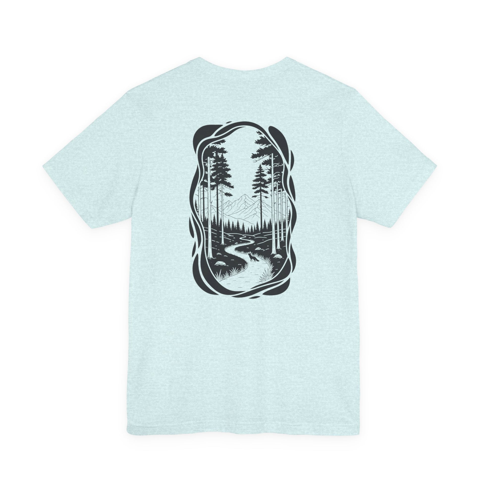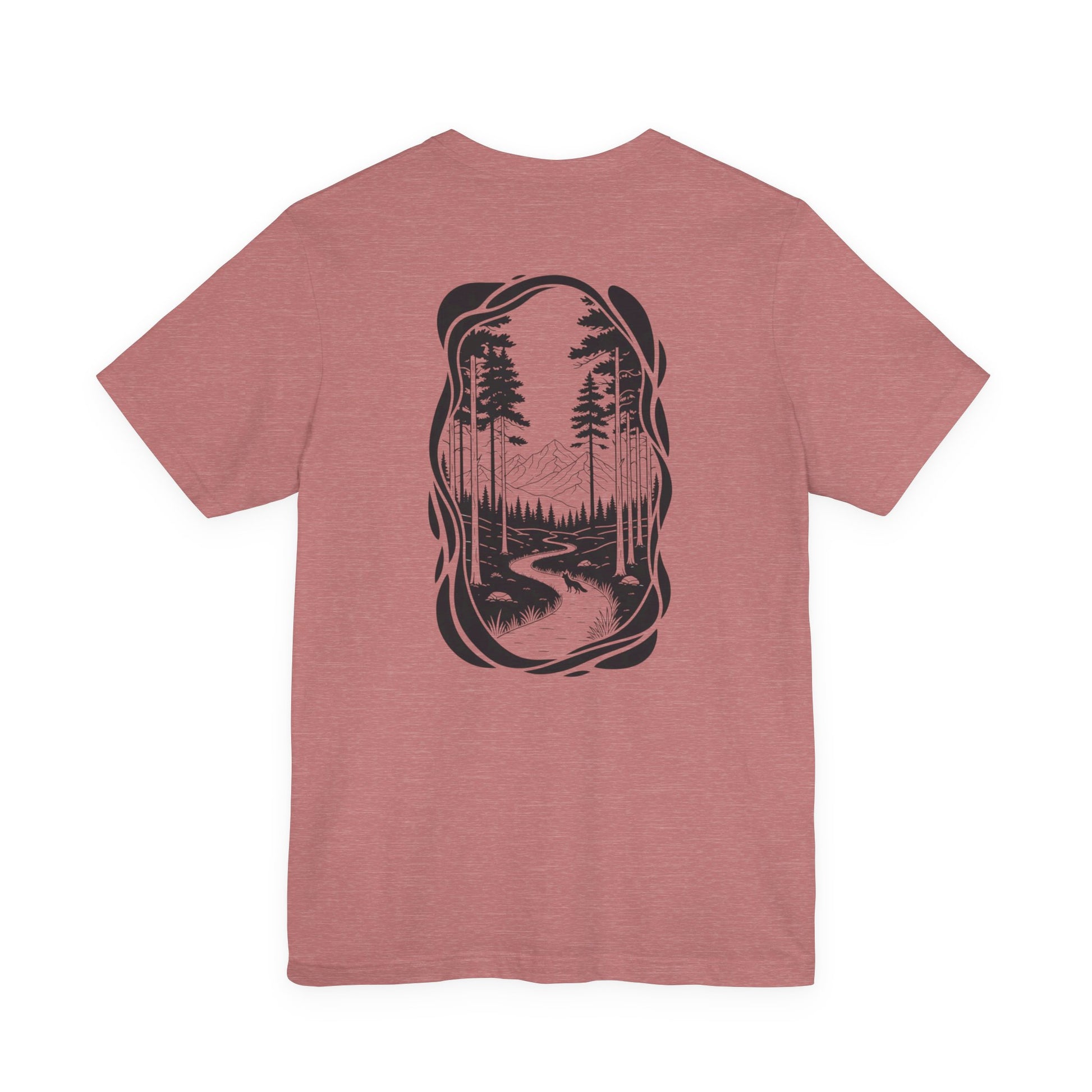 Simple, bold, and quietly captivating — The Trail Ahead Tee features a flowing path through towering pines toward distant mountains, framed in an organic border that feels carved by nature itself. This black and white graphic invites reflection, wanderlust, and a reminder to keep moving forward—one step at a time.