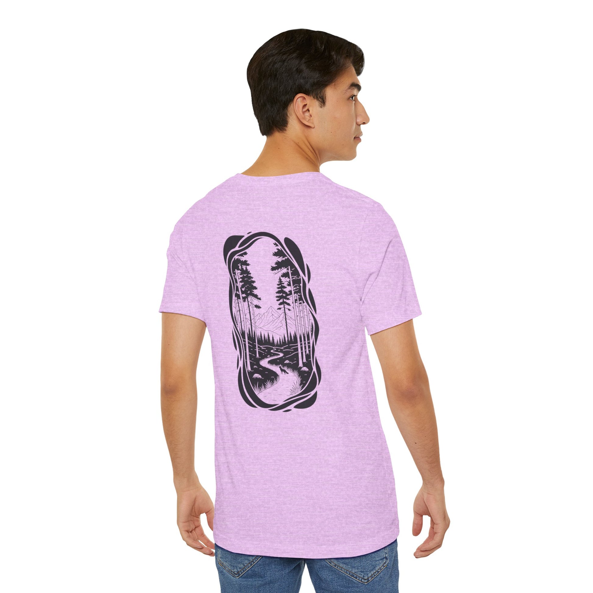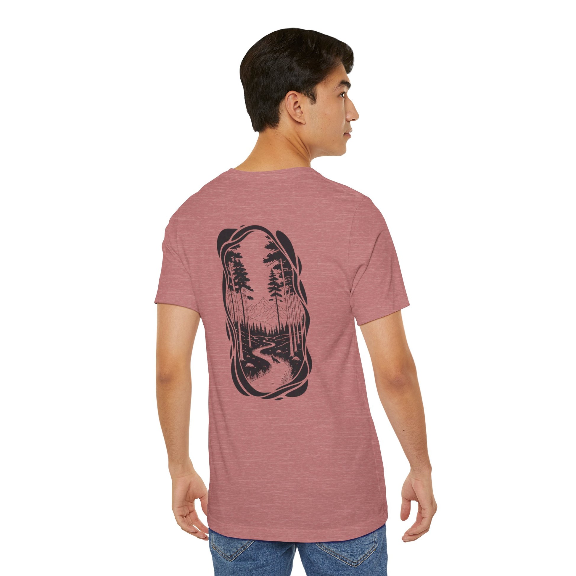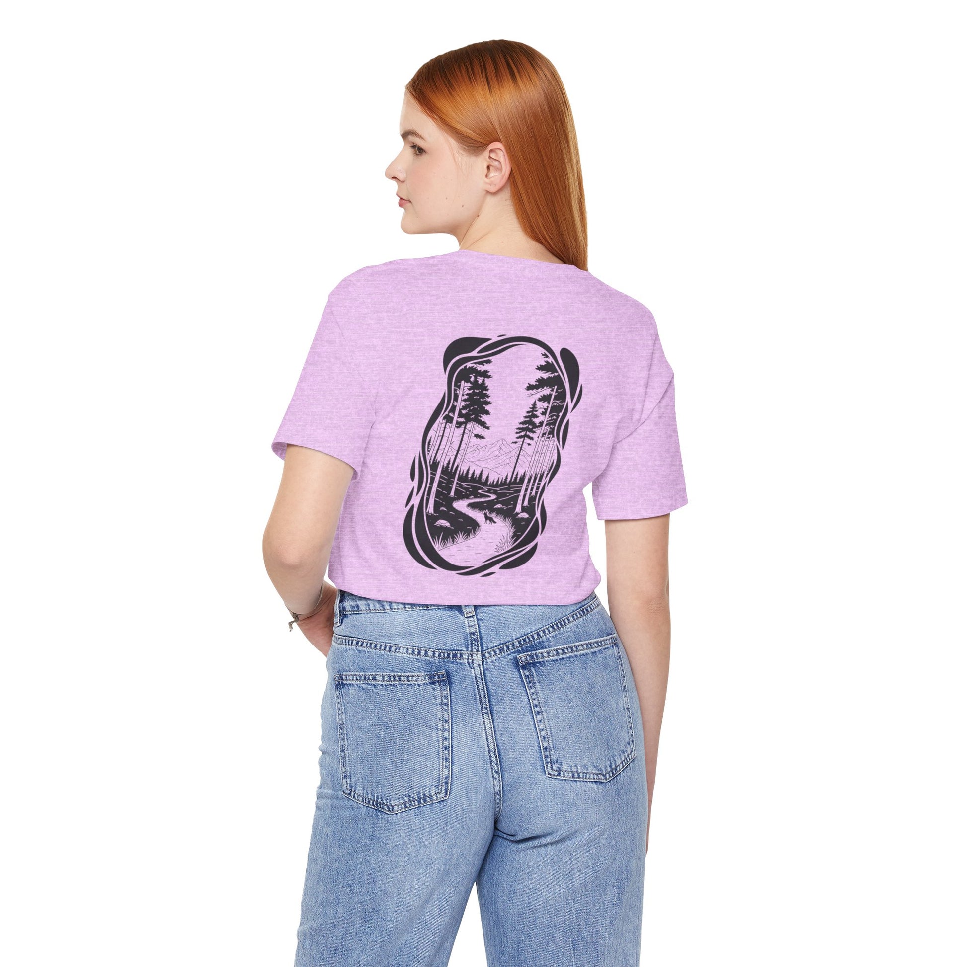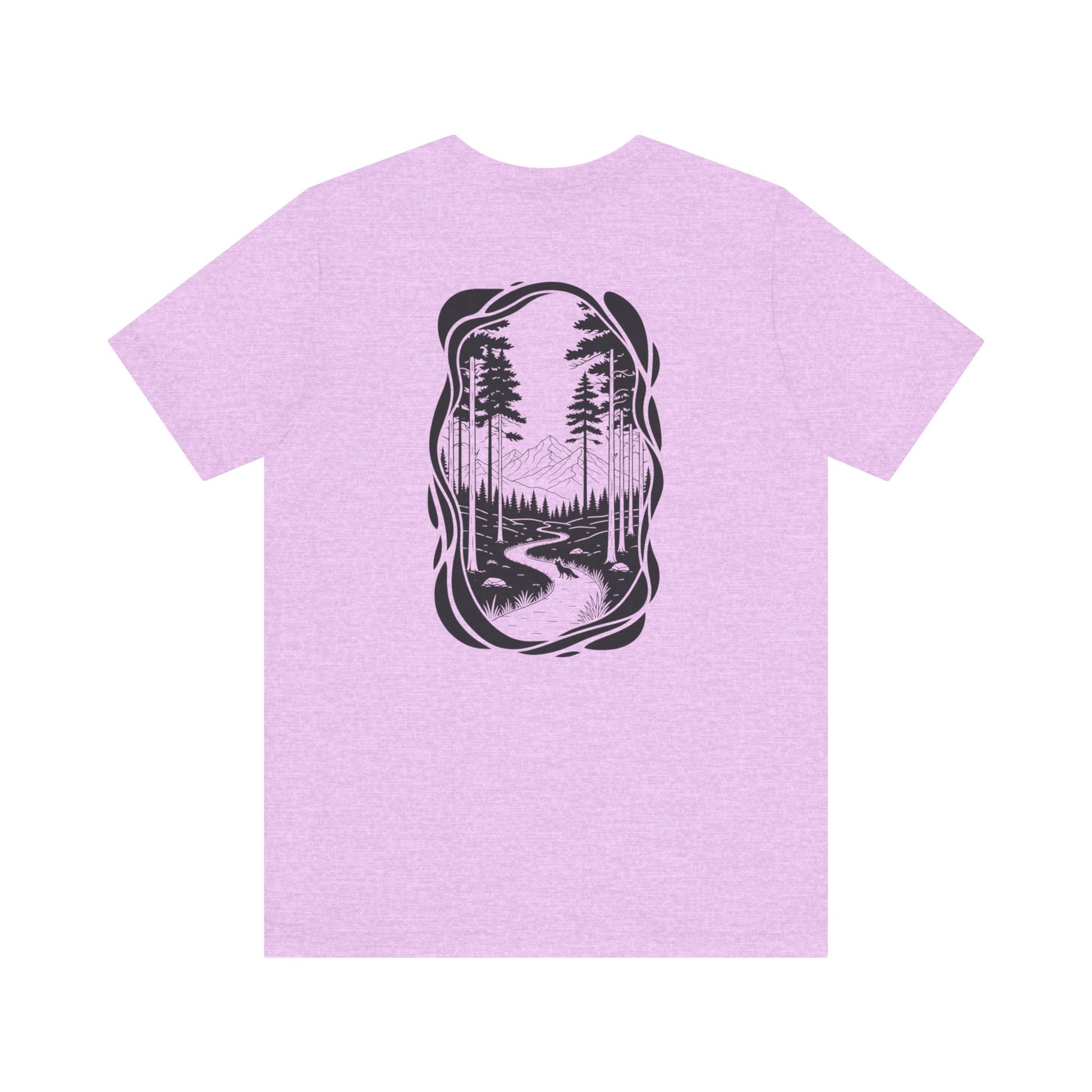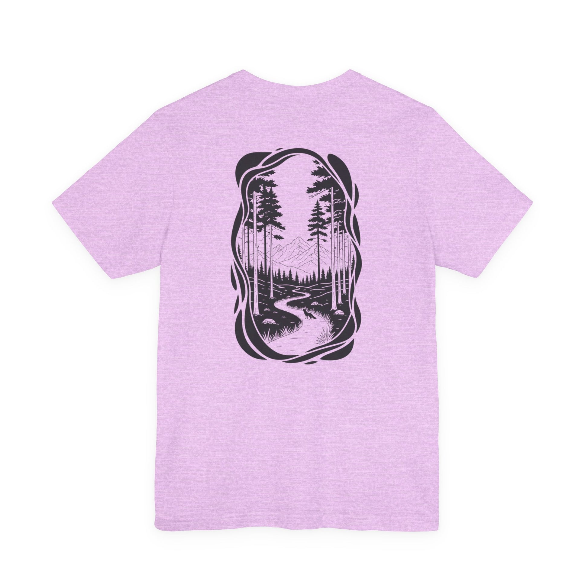 Simple, bold, and quietly captivating — The Trail Ahead Tee features a flowing path through towering pines toward distant mountains, framed in an organic border that feels carved by nature itself. This black and white graphic invites reflection, wanderlust, and a reminder to keep moving forward—one step at a time.